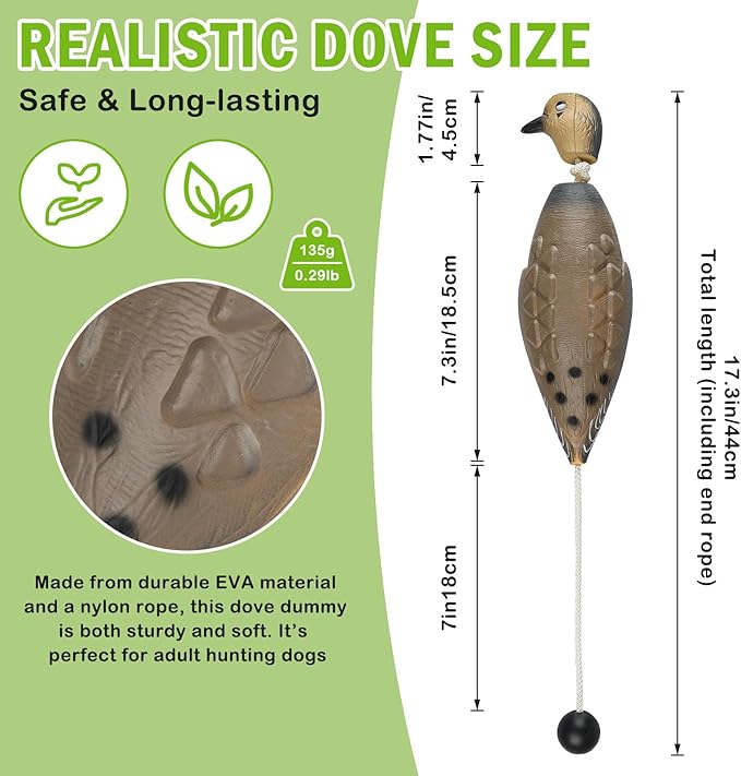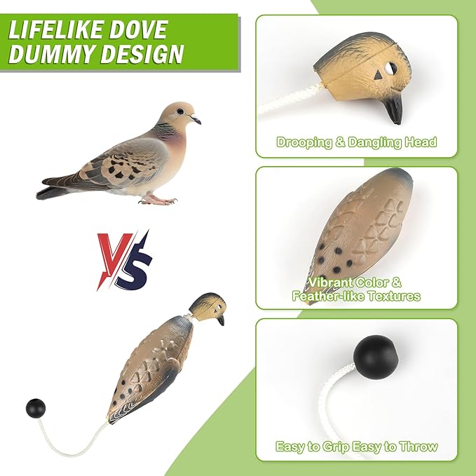 - REALISTIC DOVE DUMMY: Featuring a vivid design with a drooping head, it perfectly replicates a dead dove falling from the sky. This realistic dove dummy bumper toy helps your hunting dog adapt to handling game in its mouth. Sized similarly to a smaller dove, it has a textured body and vibrant colors, further enhancing its lifelike appeal. Let your dog experience the thrill of real hunting and enjoy enhanced interactive fun