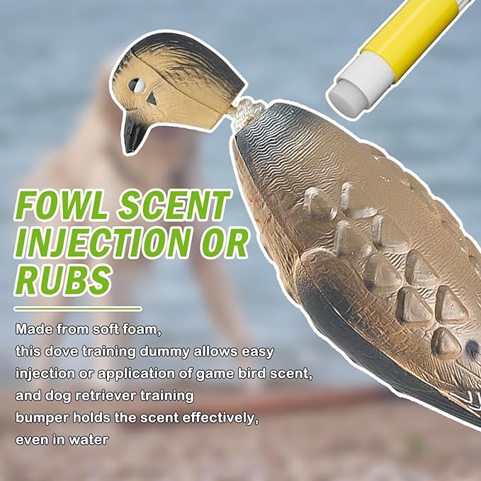 - BOTH LAND & WATER TRAINING: This dove dummy can float on water without becoming waterlogged. Perfect for a variety of training exercises, like water retrieves, distance retrieves, and basic retrieves, You can infuse the dove dummy's body with the scent of waterfowl, dove, or even duck, or you can apply it to the rope on its neck, can effectively maintain scent even in water