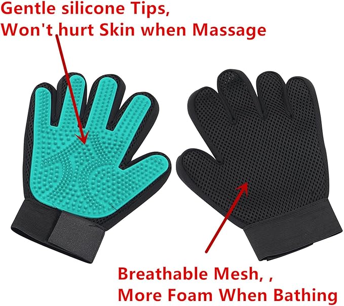 - Massage Mitt: Bathe the pets with this glove, which will clean the pet hair easily and give your pets a gentle massage without hurting their skin; Five finger design allows you to groom hard-to-reach places like tail or face