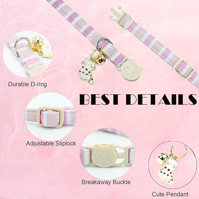 Elegant little tail 2 Pack Cat Collar-Pink Strip Cotton Breakaway Cat Collars with Bell Pendant Kitten Girl Safety Adjustable Collar for Small Cats Puppy