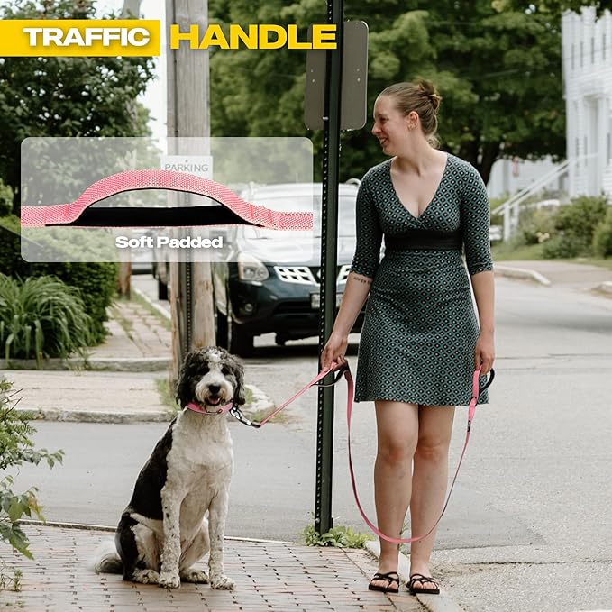 - 【DUAL HANDLES SOFT PADDED】- The soft neoprene padded handles ensure comfortable grip than ever and No More Rope Burn when your dog pulling; The traffic handle near your dog's collar provides extra, quicker, and more securely control in an emergency