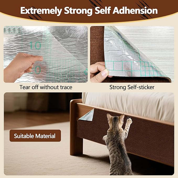 - Effortless Self-Adhesive Installation-Peel-and-stick design requires no tools or extra adhesives. Simply clean the surface, apply the mat, and press firmly. Includes spare adhesive strips and screws for versatile installation on walls, cat trees, or irregular surfaces. Removes cleanly, preserving furniture aesthetics.
