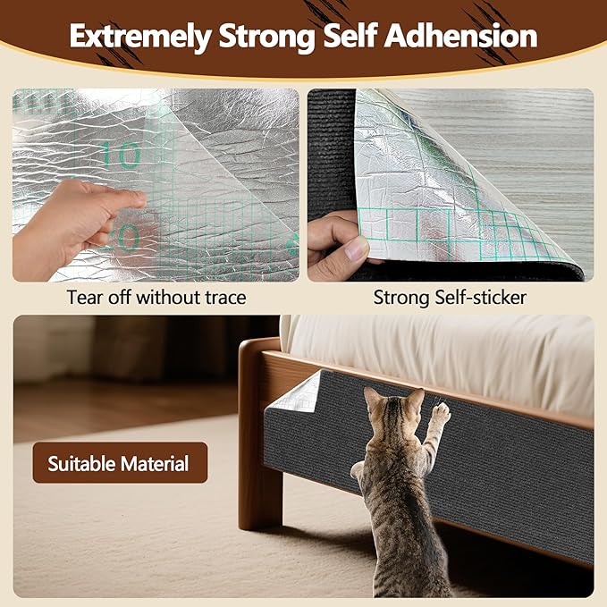 - Effortless Self-Adhesive Installation-Peel-and-stick design requires no tools or extra adhesives. Simply clean the surface, apply the mat, and press firmly. Includes spare adhesive strips and screws for versatile installation on walls, cat trees, or irregular surfaces. Removes cleanly, preserving furniture aesthetics.
