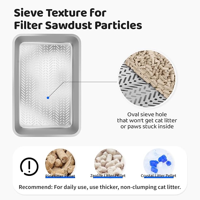 - Sifting Pan for Easy Filtering: Our cat litter box is come with removable sifting pan with elliptic holes, and does not stuck the non-clumping cat litter and helps filter urine quickly. Large granular cat litter is recommended, such as pine litter pellet