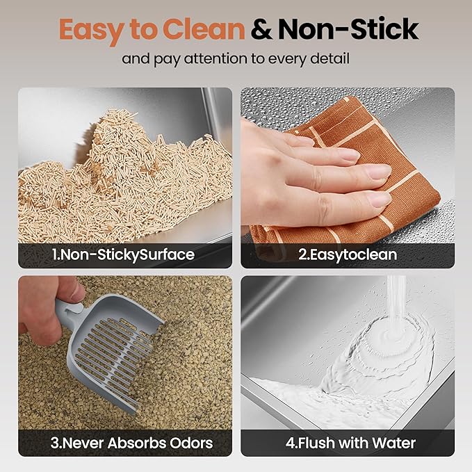 - [Easy Cleanup for Odor-Free Spaces] High-Sided Covered Litter Box Features-This litter box boasts odor resistance, a non-stick bottom, slip-proof design, no residue build-up, and a smooth surface. Unlike plastic models, the extra-large stainless steel design won’t absorb stains or odors. Plus, it comes with a free extra-large litter scoop—creating a fresh, hygienic space for your cat.