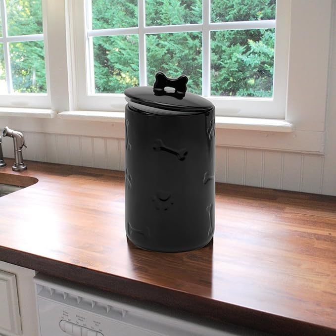 Dog Treat Container Airtight - 9"x5" Black Large Ceramic Dog Treat Jar for Kitchen Counter, Dog Cookie Jar with Lid - Farmhouse Style Dog Food Storage Container for Dogs, Cats, Pets