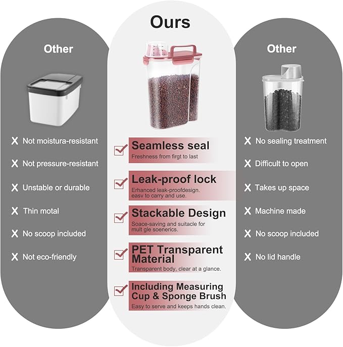 - MULTI-PURPOSE STORAGE : Our pet food container is suitable for storing dog food、cat food、bird seed、fish food、rice、 dry food、cereals、oats、flour and other large and small grains, as well as washing powder used at home. It is also a good choice.