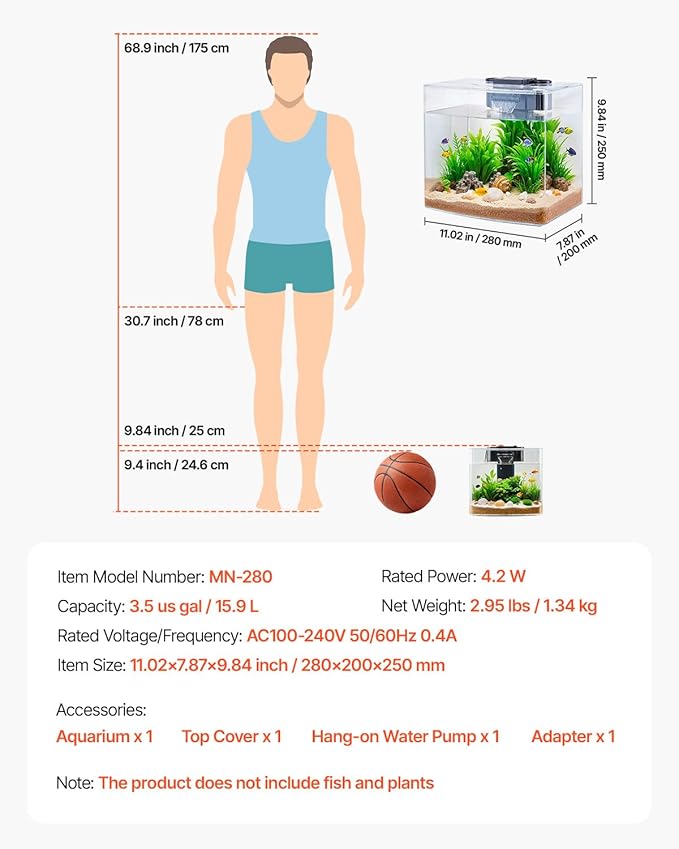 - Included Components : Adapter x 1, Aquarium x 1, Hang-on Water Pump x 1, Top Cover x 1, User Manual x 1