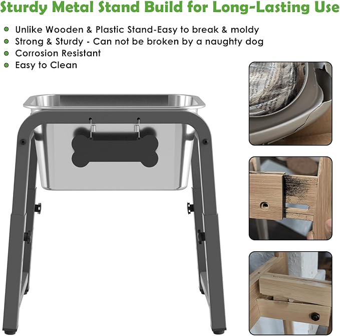 - 【DURABLE MATERIAL AND CLEANING CONVENIENCE】The water bowl is made of rust-resistant, dishwasher-safe stainless steel, which is healthier and more durable than plastic or ceramic. The stand is made of sturdy metal, which is durable in outdoor or humid environments