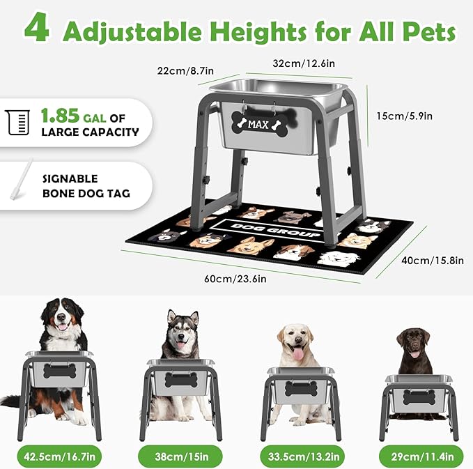 1.85 Gallon Elevated Dog Water Bowl, Height Adjustable (11–17'') Raised Stainless Steel Bowl with Spill-Proof Mat & Sturdy Metal Stand, Tip-Proof, Easy to Clean, Indoor & Outdoor Use