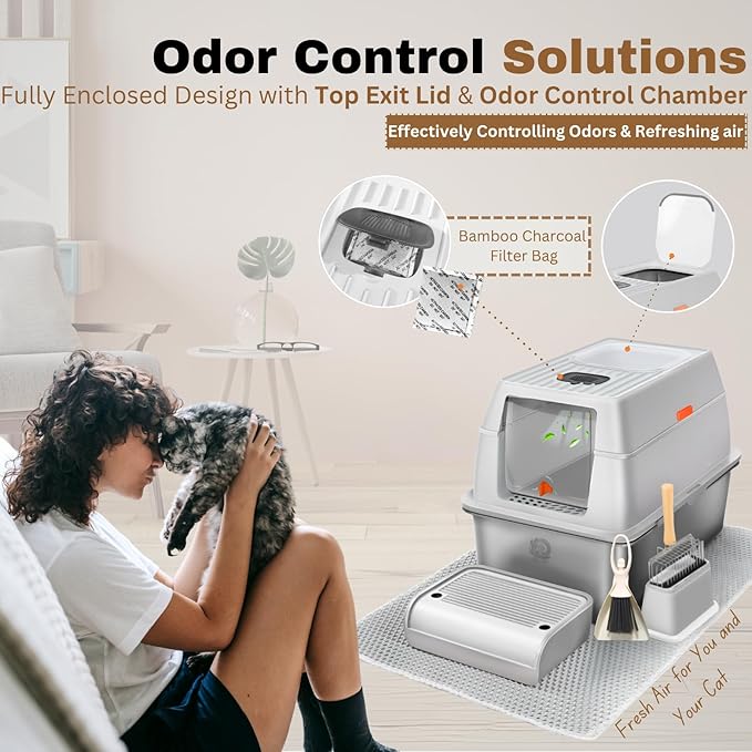 - Easy to Clean & Mess-Free Smooth, non-stick stainless steel surface of this metal litter box with lid and covered stainless steel litter box makes cleaning effortless. High-sided walls, the Elevated Step Board, and the Anti-Tracking Mat minimize litter scatter, keeping your home clean and tidy.
