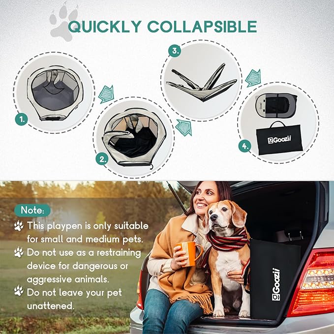 - 【Easy to use】: Remove the folded pet playpen from storage bag and unfold it in a matter of seconds. No assembly required, lightweight and strong. Our portable pet pen can be used indoors, outdoors, traveling, camping, etc.