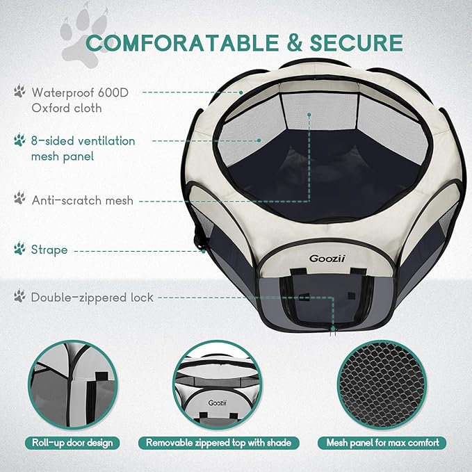 - 【Premium Construction】: The puppy playpen made of durable waterproof 600D oxford fabric, breathable mesh window shades, and reinforced with elastic iron wiring. Roomy 8 mesh panels design with strengthened seams and corners. Zippered top and gate provide easy in/out access for your pet. Keep your pet safely inside everywhere.