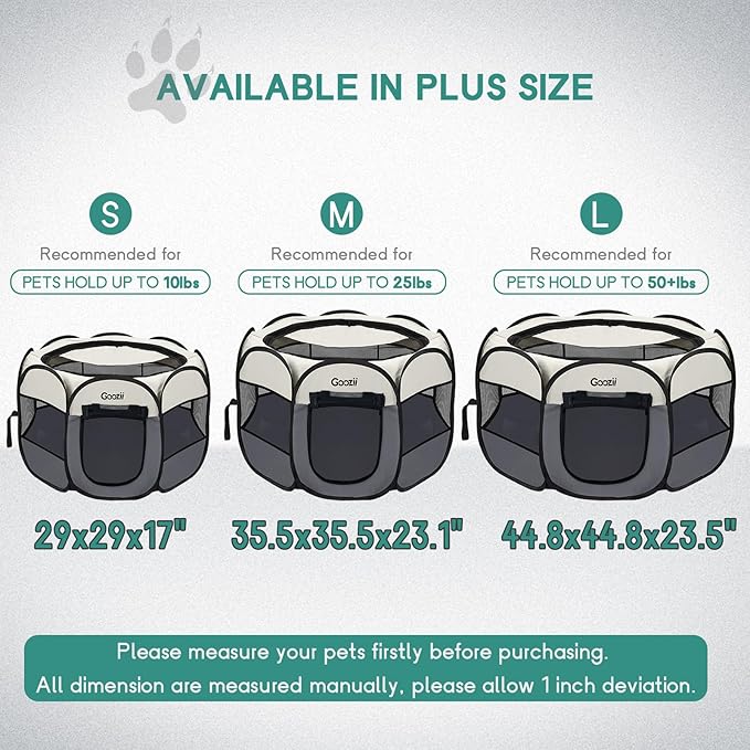 - 【Spacious & Comfort】: This dog playpen keeps your pet stay in this pet pen secure, spacious interior give more fun for your pet. Size is 35.5*35.5*23.1 inches, great for small animals up to 25 LB. There are 1 inch error range because of technical issue.
