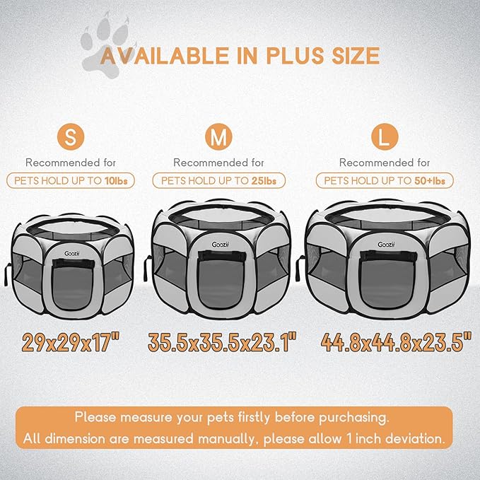 - 【Spacious & Comfort】: This dog playpen keeps your pet stay in this pet pen secure, spacious interior give more fun for your pet. Size is 35.5*35.5*23.1 inches, great for small animals up to 25 LB. There are 1 inch error range because of technical issue.
