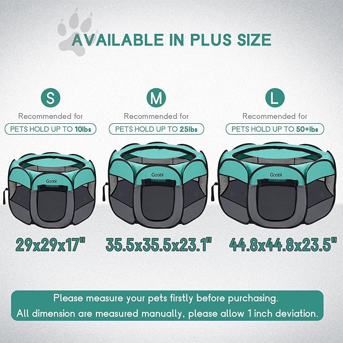 - 【Spacious & Comfort】: This cat playpen keeps your cats stay in this pet playpen secure, spacious interior give more fun for your pet. Size is 29*29*17 inches, great for small animals up to 10 LB. There are 1 inch error range because of technical issue. The Goozii pet playpen is also an ideal present as Christmas gifts for dog cat lovers.