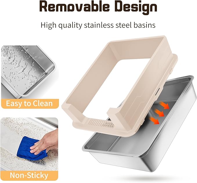 - Two Way to Use: The litter box can be used as a semi-enclosed litter box, or the top cover can be removed and the stainless steel bottom pan can be used directly. Both modes can improve ventilation and are easy to clean