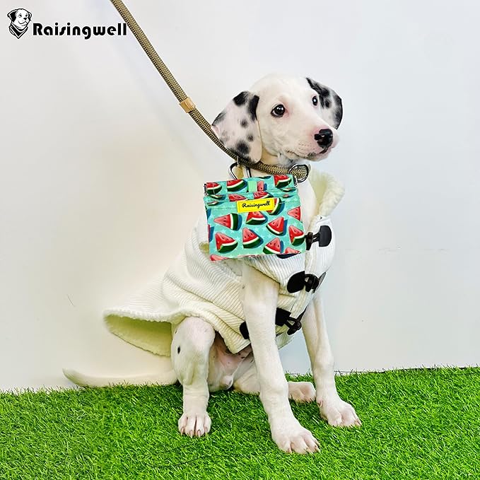 - Durable Material: Raisingwell's dog treat training pouch is crafted from durable, washable, non-toxic vegan fabric, made of pure cotton. In particular, the waterproof lining addresses the issue of difficult cleaning inside the training pouch.