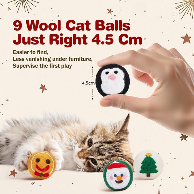 FOFOS Wool Cat Balls 9 Pcs Christmas Cat Toys Balls Hand Felted Wool Cat Toys Kitten Exercise Toys for Indoor Cats 1.7 Inches