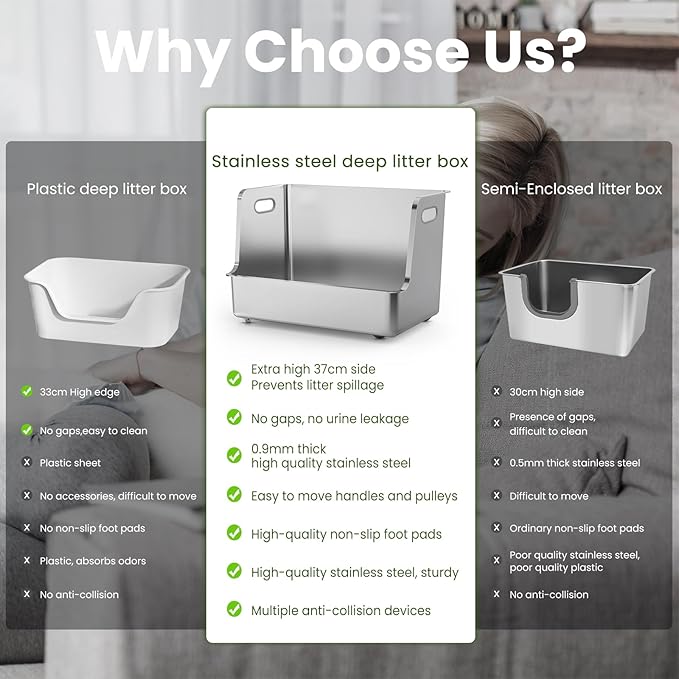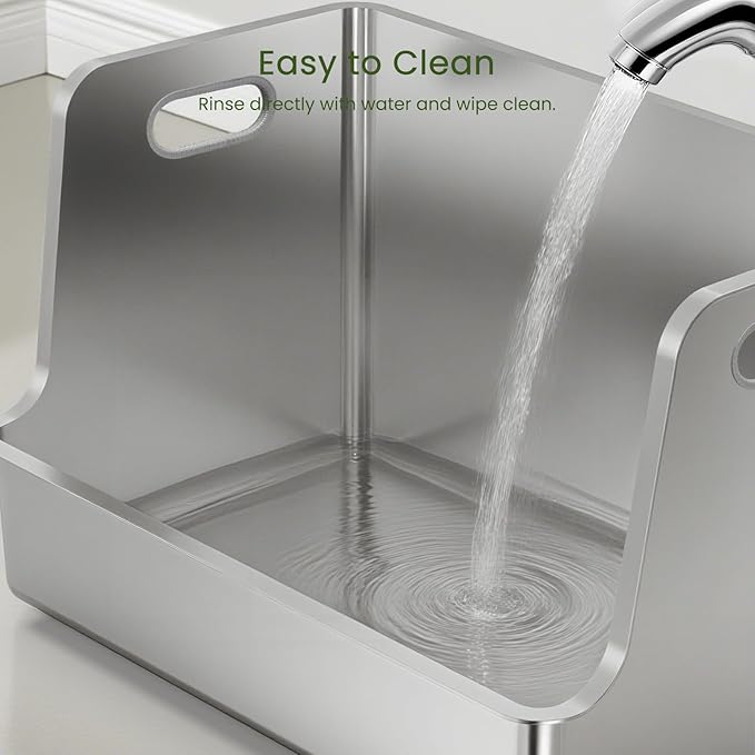 - No Odor & Easy to Clean: --The stainless steel material will not absorb any residue or odor, and the non-stick surface makes cleaning very easy, just a quick rinse and wipe with water to easily complete the cleaning. So, if you don’t like the odor of plastic cat litter boxes, but want easy cleaning, this stainless steel cat litter box is a great choice for you!