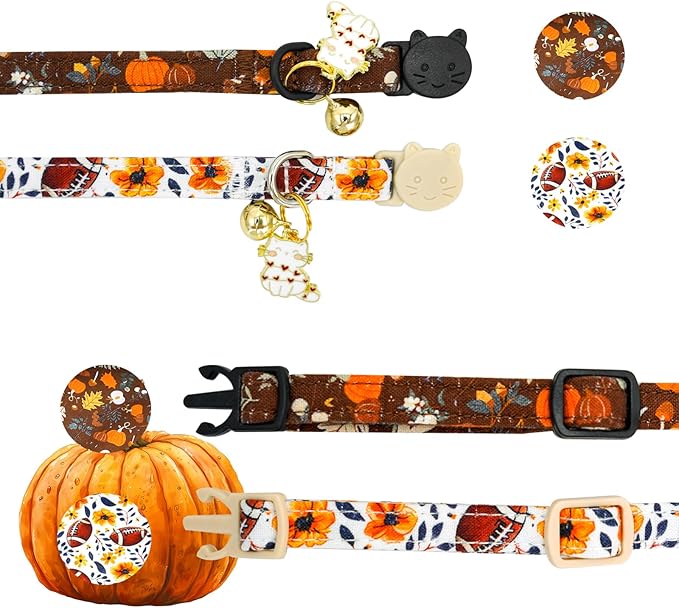Elegant little tail Fall Cat Collar-2 Pack Pumpkin with Rugby Print Cotton Breakaway Cat Collars with Bell Pendant Kitten Boy Girl Safety Adjustable Collar for Small Cats Puppy