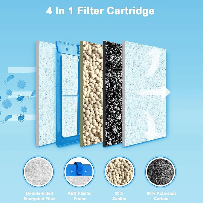 - 4 in 1 filter cartridge & all-round water quality management: Physical interception: double-sided encrypted filter, highly efficient filtration of a variety of impurities. ②Activated Carbon Reinforcement Layer: 80% more activated carbon content, continuous adsorption for up to 28 days. ③Zeolite balance layer: 20% zeolite long-lasting balance PH value, to achieve a stable water state.