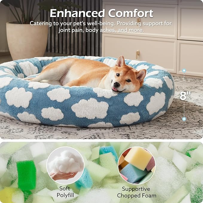 - STYLISH DESIGN: Our cute dog bed featuring Cloud patterns, this aesthetic pet bed doubles your apartment vibe. Combines soft fabric with premium chopped foam filling that maintains its shape while providing the cloud-like softness for your pet's, perfect for dogs seeking snuggles and warmth.