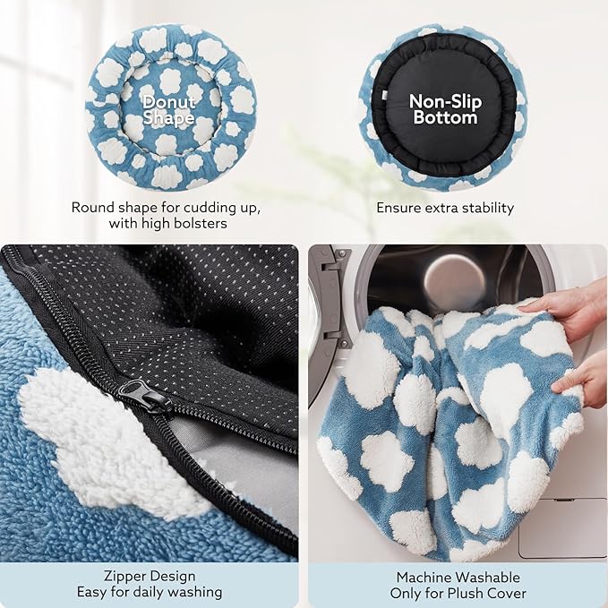 - WASHABLE DOG BED: The removable, washable cover of this donut dog bed makes maintaining cleanliness effortless. The reliable zipper to help you quickly install and reasily remove the cover from the dog bed. Simply machine wash and tumble dry to keep the bed fresh and clean. Let your pets enjoy a breathable, clean and pet bed.