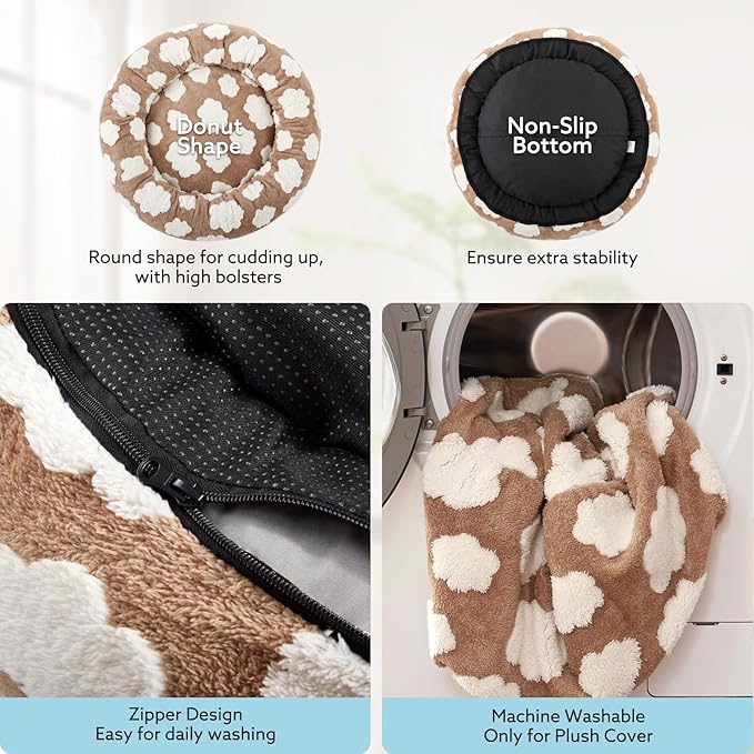 - WASHABLE DOG BED: The removable, washable cover of this donut dog bed makes maintaining cleanliness effortless. The reliable zipper to help you quickly install and reasily remove the cover from the dog bed. Simply machine wash and tumble dry to keep the bed fresh and clean. Let your pets enjoy a breathable, clean and pet bed.