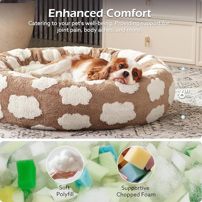 - CALMING & COMFORTABLE DOG BED: Our round donut dog bed combines soft plush fabric with premium chopped foam and polyfill filling that maintains its shape creates a cozy and inviting space that promotes comfort and security, perfect for small to medium dogs seeking snuggles and warmth. Designed with raised bolstered edges for dogs to rest their heads on for optimum lounging comfort.
