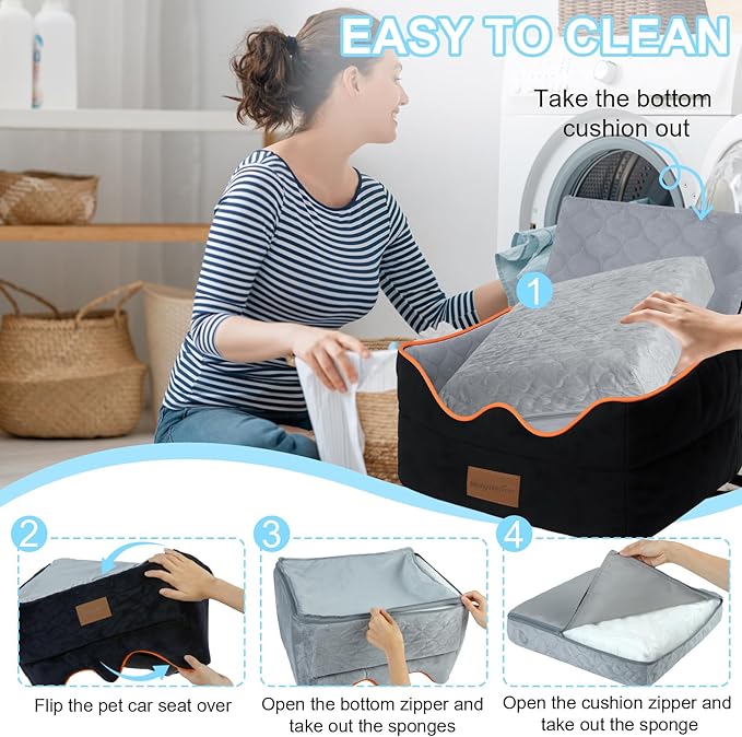 - 【Removable and Washable】 The dog carseat is completely removable and washable, just open the bottom zipper to take out the sponge and put the dog car seat cover into the washing machine for cleaning. NOTE: the inner sponge is not washable.
