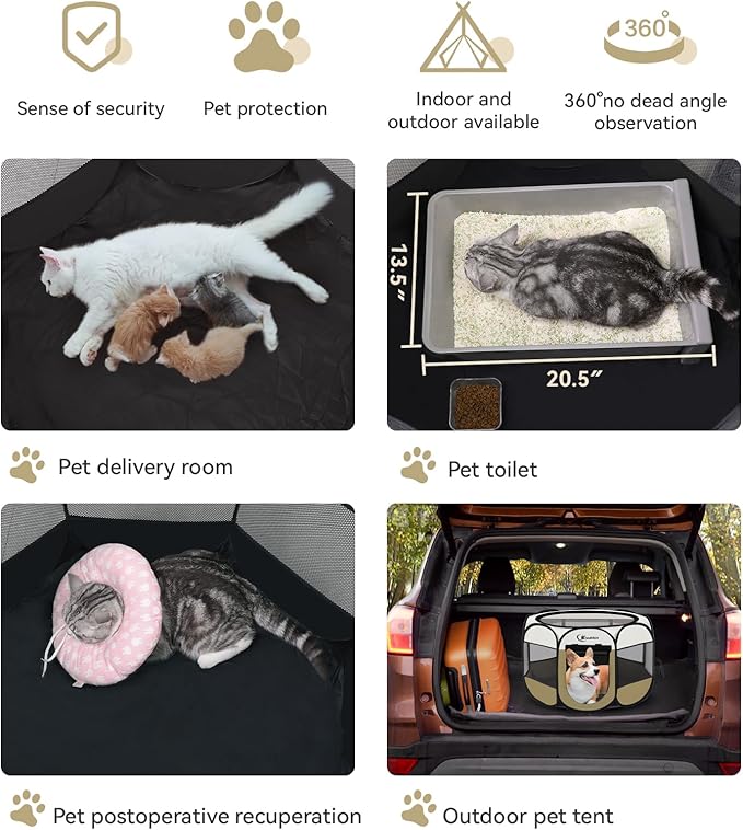 - 【No Assembly required】Opening the dog pen takes only a few seconds, is lightweight, strong, and does not require assembly. When not in use, it can be folded into the tote bag provided by us, which takes up minimal space and is easy to carry and store. Spacious interior Spaces allow your pet to play, sleep, hide or isolate. Perfect for indoors, lawns, beaches, parks, Tours, camping and more!