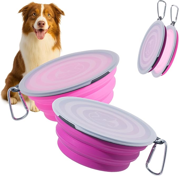 SLSON Dog Bowls Pet Collapsible Bowl with Cover Lids,2 Pack Dog Travel Bowls Portable Foldable Cat Water Dish Bowl for Pets Walking Parking Camping (Pink and Purple, Medium)