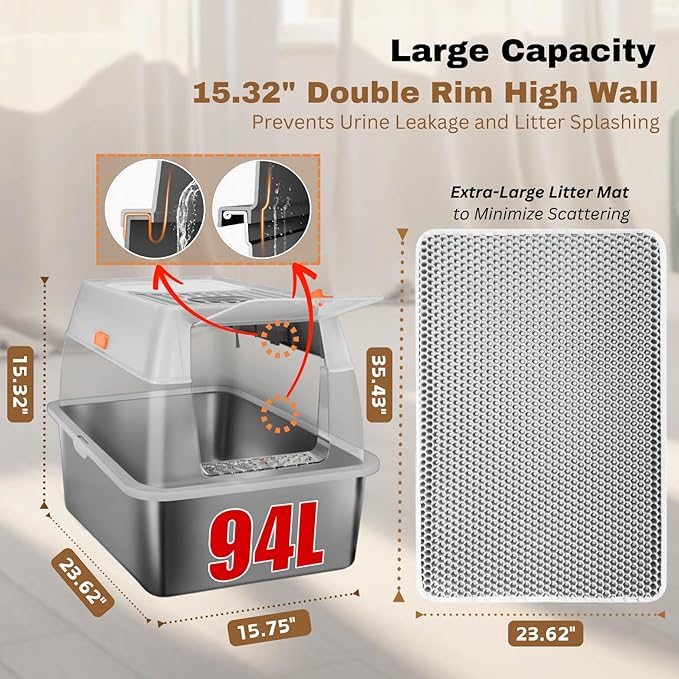 - Spacious XL - The spacious 94L Cat Litter Box Stainless Steel and Stainless Steel Litter Box XL with an 6" deep litter pan holds up to 36L of litter, perfect for big cats or multi-cat households, ensuring comfort, reducing mess, and providing ample space for big cats to move around and dig comfortably.