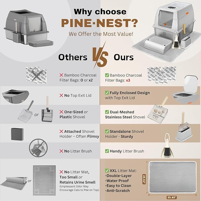 - Complete Accessory Set of this Stainless Steel Litter Box with Cover and Tall Stainless Steel Litter Box includes a Stainless Steel Shovel + Standalone Shovel Box, Elevated Step Board, Anti-Tracking Mat (35.4” x 23.6”), Litter Brush, and 3 Bamboo Charcoal Filter Bags, offering a comprehensive and mess-free solution.
