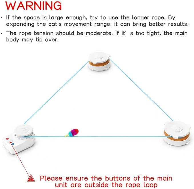 - 【DIY Play Paths】Place safe obstacles inside the rope’s circle to expand the play area. By adjusting the position of the main unit and sub-units, you can create different movement tracks to suit various indoor layouts. This unique setup increases challenge, improves agility, and adds more fun—turning the toy into a creative indoor cat treadmill alternative.