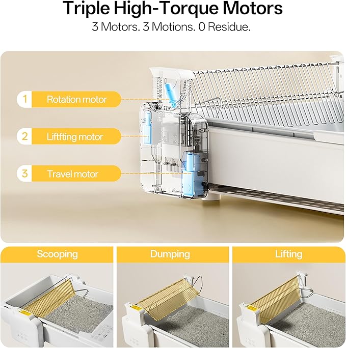 - 🐾 EFFICIENT, THOROUGH, HANDS-FREE CLEANING – Powered by 3 high-torque motors, the metal rakes perform horizontal, flipping, and lifting motions for complete, carpet-style waste removal. Our patented dual-rake design ensures no leftover residue: the main rake powerfully scoops clumps, while the secondary rake scrapes away residue for a thorough, residue-free clean every time.