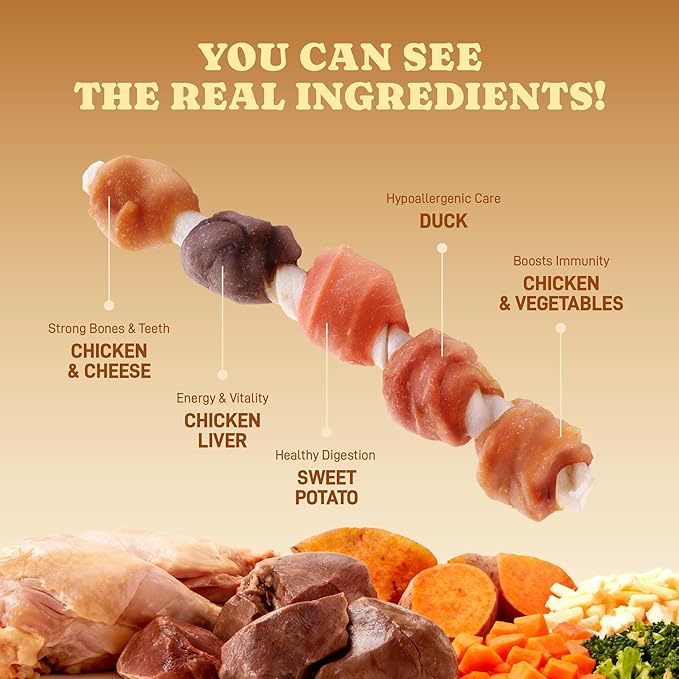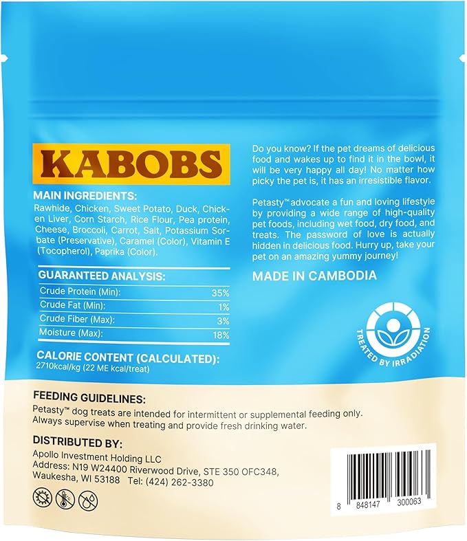 - Rich Multi-Flavor Kabobs Dogs Love:Petasty dog kabobs snacks made with real chicken, duck, sweet potato, chicken liver, cheese, and vegetables, these layered kabobs deliver a savory, each bite a delightful surprise.