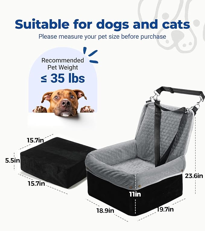 - [Ideal Size for Small and Medium Dogs]: With dimensions of 19.7" (L) × 18.9" (W) × 23.6" (H), this dog car seat comfortably holds pets up to 35 lbs. It works well as both a dog car seat for small dogs and a medium dog car seat. The 5.4-inch elevated cushion gives pets a better view outside, helping reduce travel anxiety.