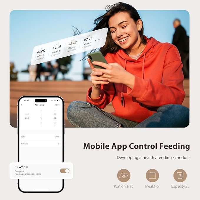 - Guard Your Pet's Health: Customize meal plans to help develop good behavioral habits. With the automatic cat feeder, you can create a healthy diet for them, with 1-10 meals per day and up to 15 portions per meal (each portion is 7-9g). You can also manually feed them slowly. Choose according to your pet's needs to control their weight and let them have a healthier eating pattern