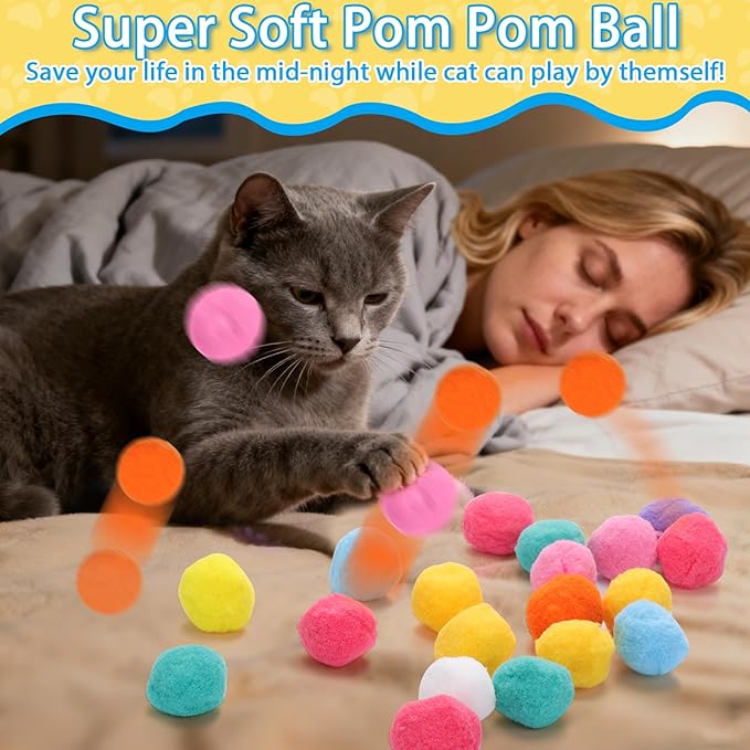 - 100 PCS Soft Pom Pom Balls: Comes with 100 plush pom pom balls, 3 times more than other cat toys. No need to stop to find lost balls—keep your kitten toys sessions active and full of excitement every day