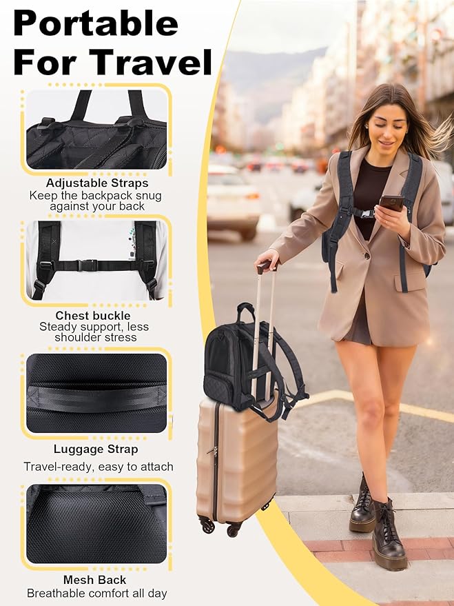 - 【Travel-Friendly Design】The backpacks is equipped with adjustable padded shoulder straps and chest buckles for a comfortable carrying sensation for the owner. This multi-functional pet backpack features a designed luggage strap on the back, making it easy to attach to a suitcase. It is suitable for short trips, visiting the vet, outdoor hiking, camping or city outings. It not only frees your hands but also keeps you close and safe with your furry companion.