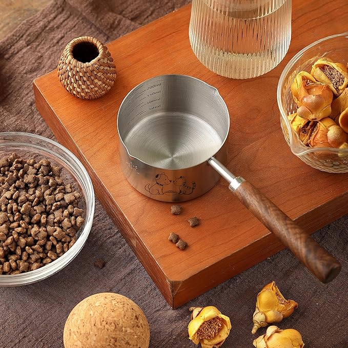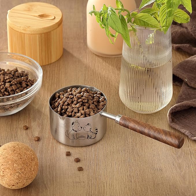 - 4. Ergonomic Wooden Handle: The sturdy wooden handle of the dog food measuring scoop provides a firm, non-slip grip that makes scooping food effortless, even from large bags of kibble. Smoothly polished of the pet dog food scoop for comfort, it prevents hand strain and offers a better experience compared to all-metal or plastic scoops. Durable and elegant, it complements your kitchen and cat food measuring cup.