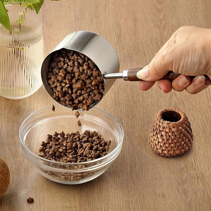 - 5. Multi-Purpose Dog Food Measuring Cup: More than just a pet dog food scooper, this versatile 1-cup stainless steel measuring cup can also be used in the kitchen for rice, flour, beans, oats, coffee, or liquids. Perfect for cooking, baking, and portioning meals, making it a practical 1 cup scoop that serves both your pets and your household.