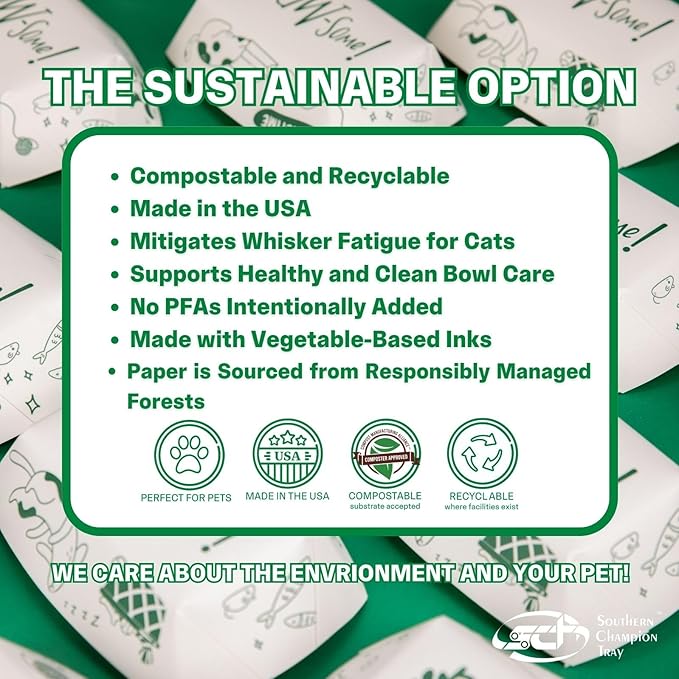 - SUSTAINABLE: Made from compostable and materials, our eco-friendly pet food trays, or pet food bowls, let you care for the planet while caring for pets. A perfect choice for clinics and shelters wanting to adopt more sustainable practices. These trays are MADE IN THE USA with water-based inks, and are completely where facilities exist!