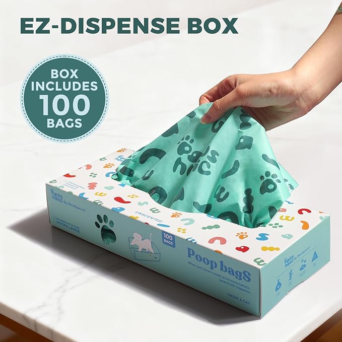 - 【Grab-N-Go】 Getting a poop bag is easier than ever! Our improved tissue-box style packaging with a wider opening lets you smoothly grab one bag at a time. Quick and convenient, exactly when you need it!