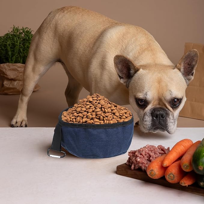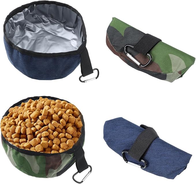 - Complete Set: This set includes two dog bowls with connecting buckles, providing a backup for longer trips or with multiple pets. Dark blue and camouflage green color options provide versatility, while the consistent 16x7 cm(6.2x2.7inch) size ensures reliable performance. Having two bowls allows you to use them separately for food and water, or share them with other pet owners on group outings.