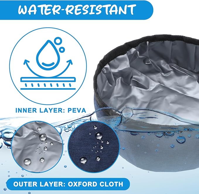 - Durable Construction: These foldable dog bowls are made of waterproof Oxford cloth with a PVEA lining, making them tear-resistant and suitable for long-term use. The sturdy material retains its shape when filled with 40 ounces of water or food, preventing tipping and spilling. This durable construction ensures reliable performance during outdoor activities like hiking and camping, providing a stable feeding solution for your pet regardless of the terrain or weather conditions.