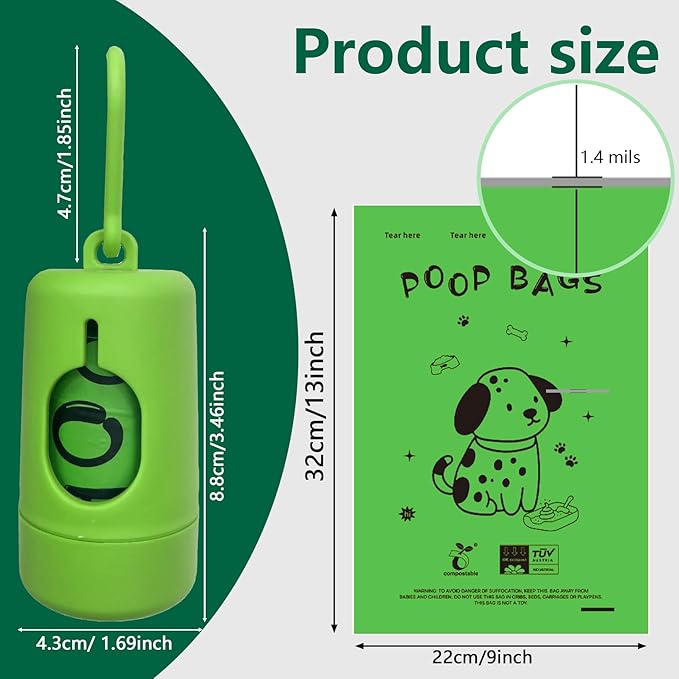 - Dog poop bag rolls made from 100% plant-based materials: made from plant ingredients such as corn and cassava. Our products have passed TÜV AUSTRIA certification and comply with ASTM D6400 and EN 13432 standards. Providing cautious choices for responsible pet parents