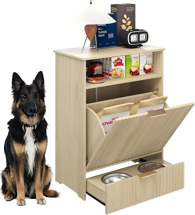 - ELEGANT ALL-IN-1 FEEDING STATION: This crafted pet feeding cabinet features 2 elevated stainless steel bowls, a tilt-out food bin, and an open shelf for treats—keeping everything tidy and within reach